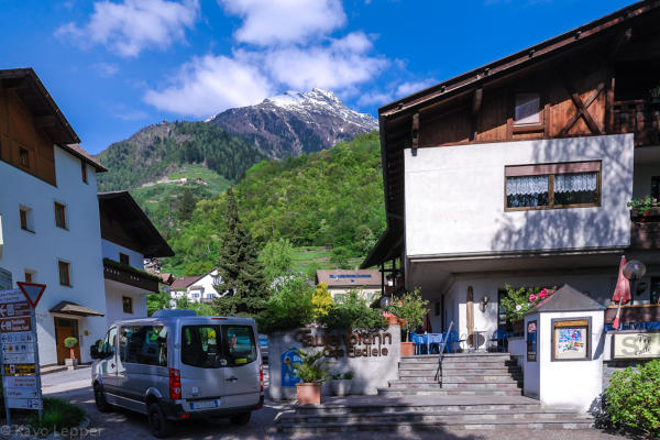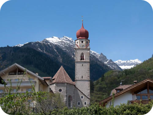 Blick über Apfelbäume und den Ort in den Vinschgau